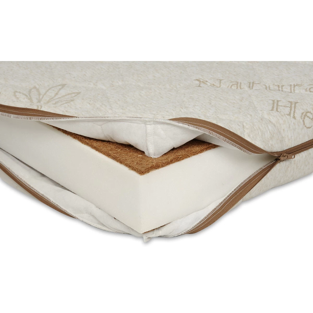Het matras is opgebouwd uit twee stevige en degelijke kokosmatten die door middel van natuurrubber zijn verbonden, met daar tussenin een vulling van polyurethaanschuim. Hierdoor wordt het gewicht goed over het matras verdeeld wat de slaapkwaliteit van je kindje bevordert! Door deze opbouw is het matras aan beide kanten te gebruiken.