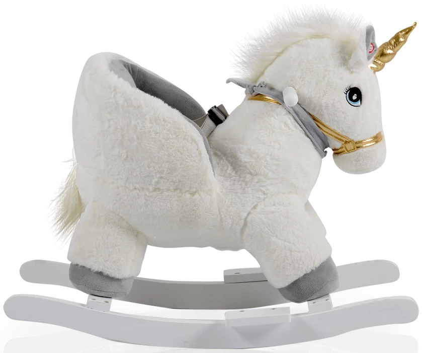 Het hobbeldier is een eenhoorn in het wit, als je kleine in de oren drukt zal de eenhoorn geluid maken. Je kindje kan zich vasthouden aan de houten handvatten en dankzij de voetensteunen kan je kleine zijn/haar voeten goed kwijt. Geschikt voor kindjes vanaf 12 maanden.