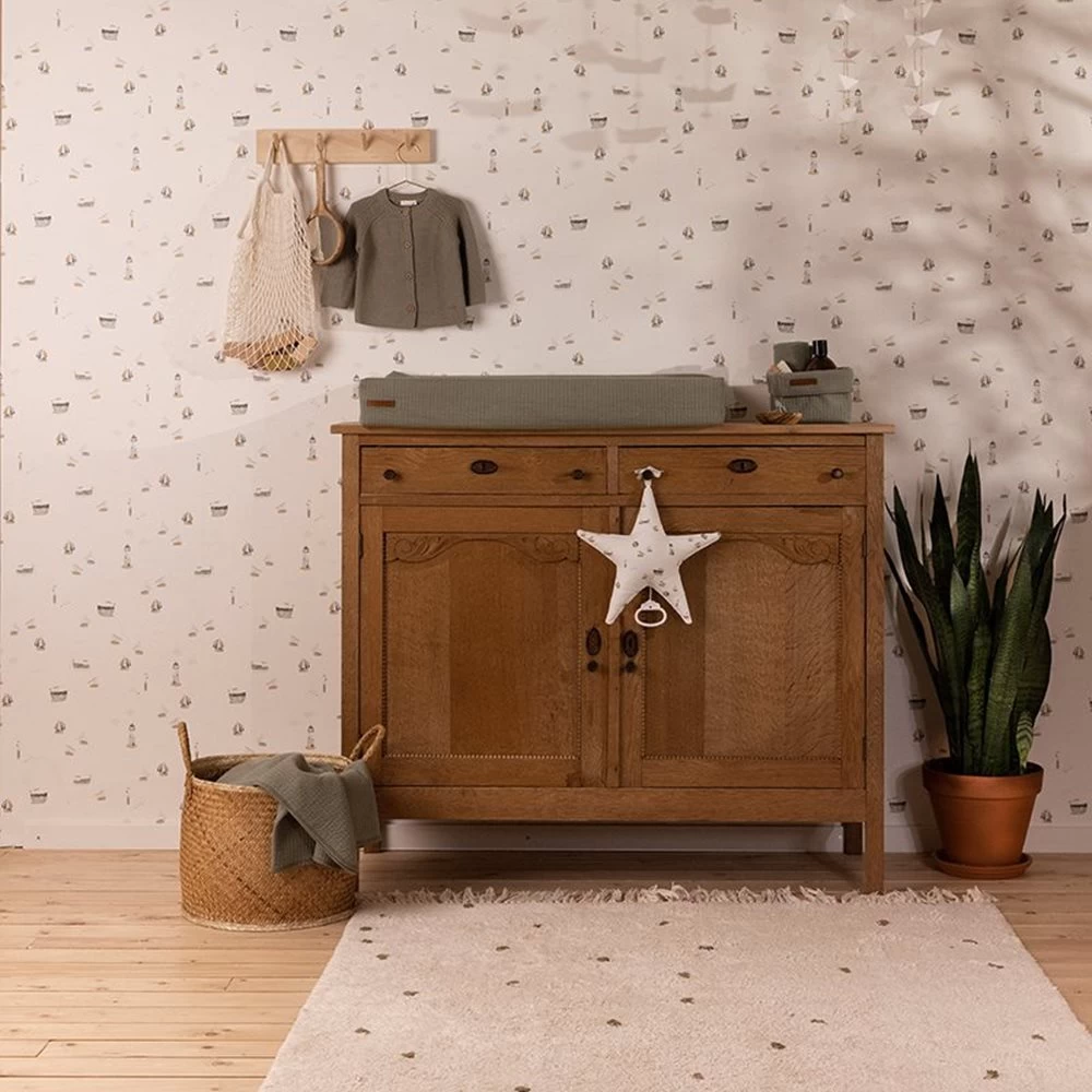 Een opvallende wand creëren in de baby- of kinderkamer? Dit leuke behang uit de Sailors Bay collectie tovert de kamer om tot een serene baai. Waar de vuurtoren de zeilers veilig de haven in loodst, de vissers binnen varen met hun dagvangst en het geluid van zeevogels de boventoon voert. De neutrale achtergrond is versierd met bootjes, een vuurtoren en, als je goed kijkt, Jack de zeemeeuw en zijn vriendjes. Een serene nautische sfeer voor je kleintje om in weg te dromen. Dit behang is gedrukt op vliesbehang, heeft een breedte van 300 centimeter en een lengte van 280 centimeter. Het Sailors Bay White behang combineert prachtig met de volgende kleuren uit de Little Dutch muurverf collectie: Faded Blue, Pure Blue, Waves Beige, Pure Olive en Faded Olive. Waarom kiezen voor digitaal behang? Om je wand gemakkelijk en snel een trendy metamorfose te geven kies je voor digitaal behang! Digitaal behang (oftewel fotobehang) is een digitaal gedrukt beeld wat in vooraf gedefinieerde behangbanen is verdeeld. Dit maakt het behang zeer gemakkelijk aan te brengen omdat er in tegenstelling tot veel regulier behang geen patroon gezocht hoeft te worden. Je kunt het behang gemakkelijk per baan in de aangegeven volgorde op de muur plakken. Dit fotobehang is gedrukt op kwalitatief hoogwaardige vliesdrager. Hierdoor is er geen behangtafel nodig en kun je de behanglijm direct op de muur aanbrengen en het behang direct op de muur verwerken. Ook is het vliesbehang gemakkelijk weer te verwijderen, er is geen stoomapparaat nodig en er blijven geen resten achter.
