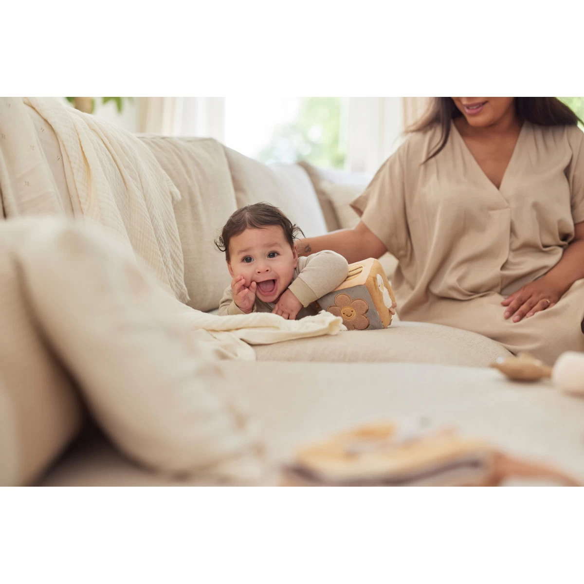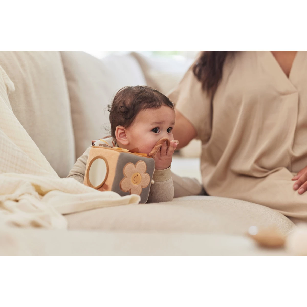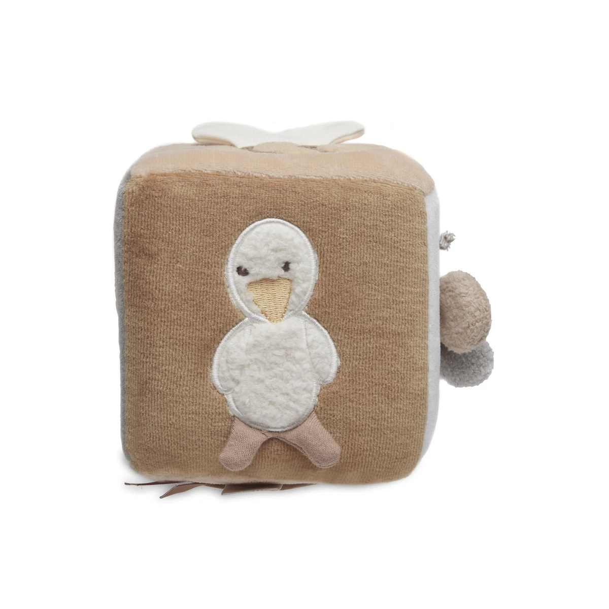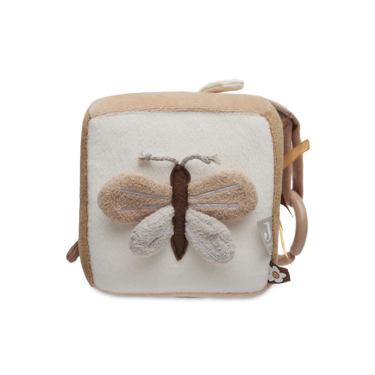 De kubus heeft knisperende elementen, verschillende texturen en figuurtjes, kleurrijke labeltjes, een leuke babyspiegel en een handig koordje met plastic ring waarmee je hem makkelijk vastmaakt aan bijvoorbeeld de kinderwagen of de box. De kubus is 12 x 12 x 12 cm groot en is gemaakt van 100% velours en gevuld met 100% polyester fibre fill.