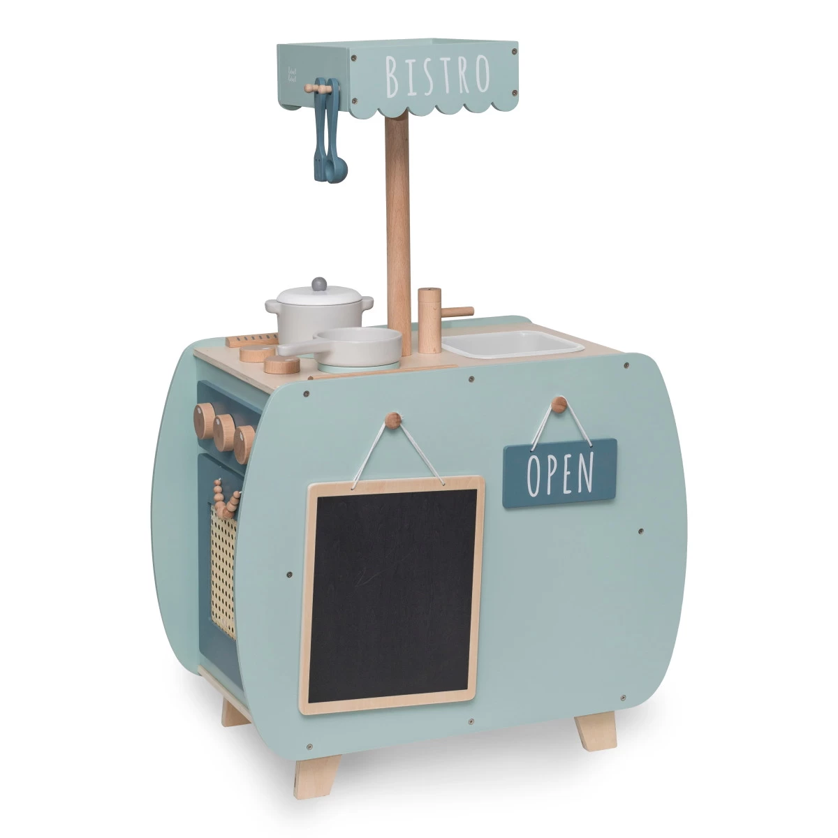 Doordat het kookeiland is voorzien van verschillende schattige details zoals de knoppen van het gasfornuis en de leuke handvaten, lijkt het net een echte grote mensen keuken. Daarnaast kunnen ook alle deurtjes geopend worden. Omdat je kindje rond om de keuken kan lopen, kan hij of zij ook samen met een vriendje of vriendinnetje de sterren van de hemel koken. De keuken heeft aan alle kanten wat te beleven en heeft de afmetingen 60 x 34,5 x 51/89 cm. De totale hoogte van de keuken is 89 cm, de hoogte van het werkblad is 51 cm hoog. Het bistro keukentje is geschikt voor kinderen vanaf 3 jaar.
