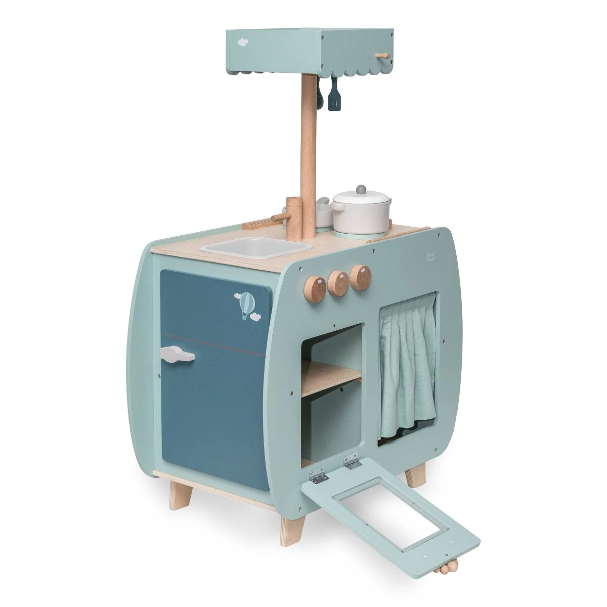 Een appeltaart of de lekkerste cupcakes bakken is met dit kookeiland geen probleem. Het keukentje beschikt over een magnetron, oven, koelkast, verschillende opbergvakjes, een wasbak, een fornuis, een afzuigkap en een kraantje. Maar je kunt natuurlijk niet iets koken zonder keukengerei of pannen, daarom zitten er 2 pannetjes, een lepel, een spatel en een echte koksmuts bij inbegrepen. Is jouw kindje klaar met koken? Dan kan het keukengerei makkelijk worden opgehangen aan de afzuigkap, de pannetjes kunnen terug in de kastjes of achter het gordijntje worden opgeborgen. Opgeruimd staat netjes.