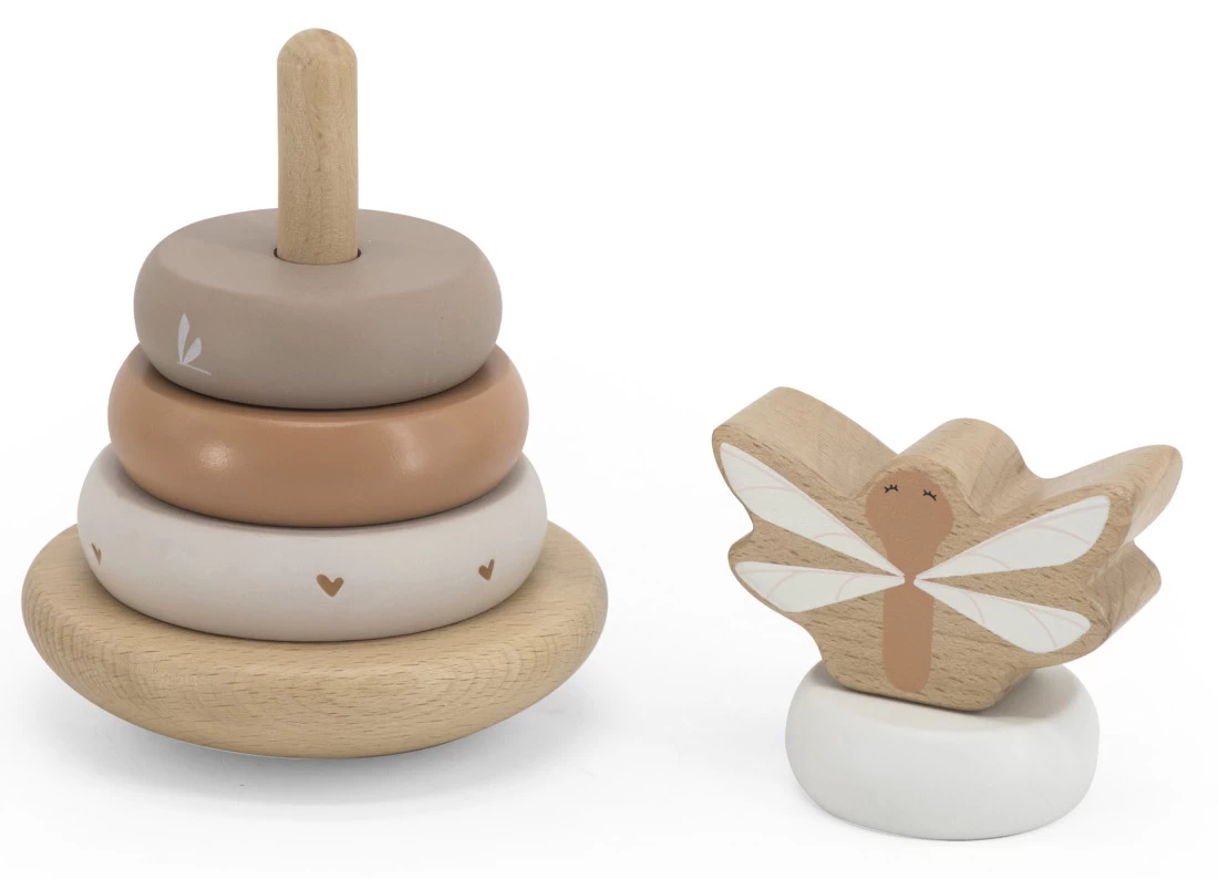 Wat zal jouw kleintje veel speelplezier beleven met deze houten tuimelringpiramide van Label Label! Deze stapelpiramide bestaat uit 6 verschillende onderdelen met zachte nougat kleuren. De libelle bovenop maakt het helemaal af!