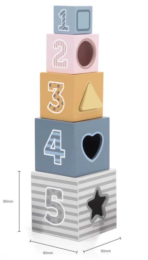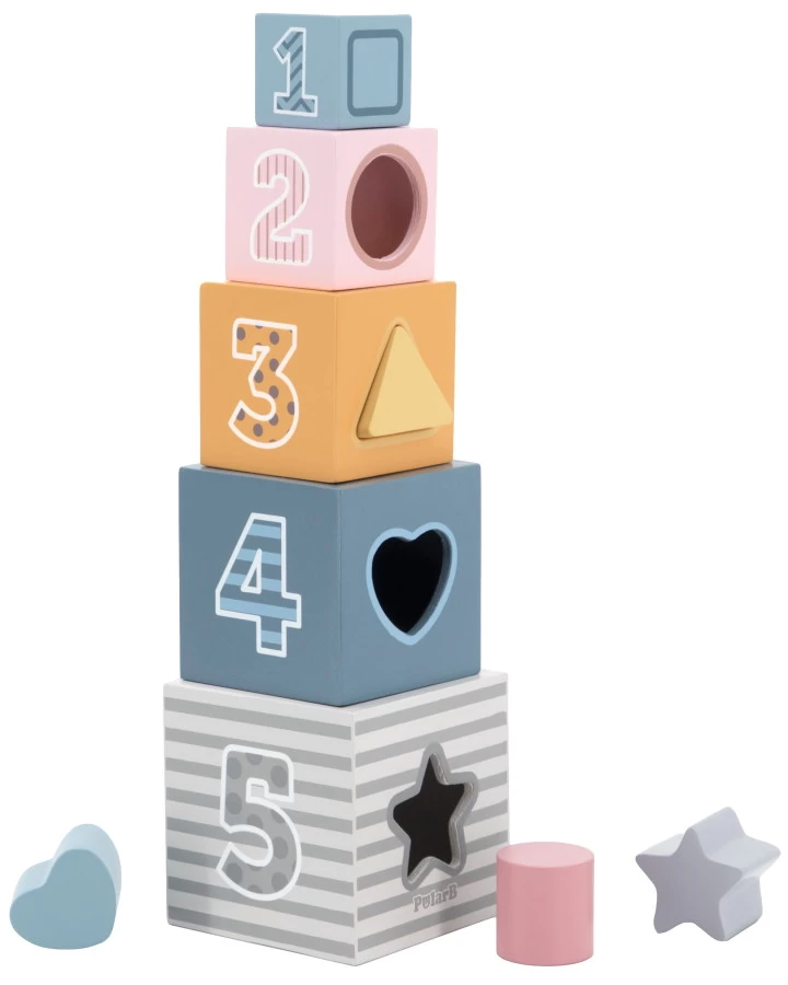 Kan jouw kleine deze kubussen opstapelen zonder de toren te laten vallen? Met de PolarB 2-in-1 houten stapelblokken en vormenstoof leert je kleintje spelenderwijs. De 5 kubussen hebben allemaal andere kleuren, figuurtjes en cijfers wat erg leuk is!