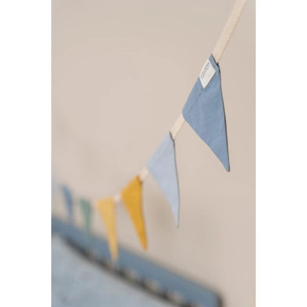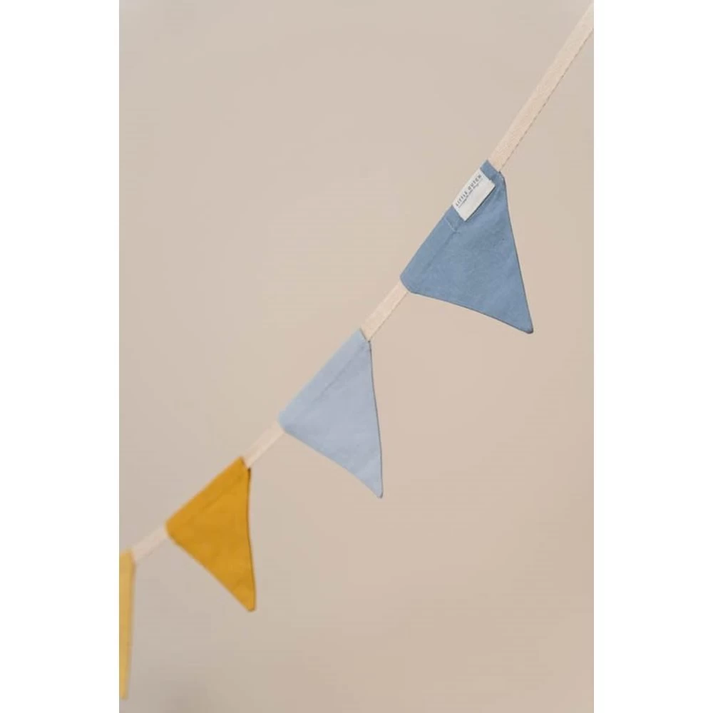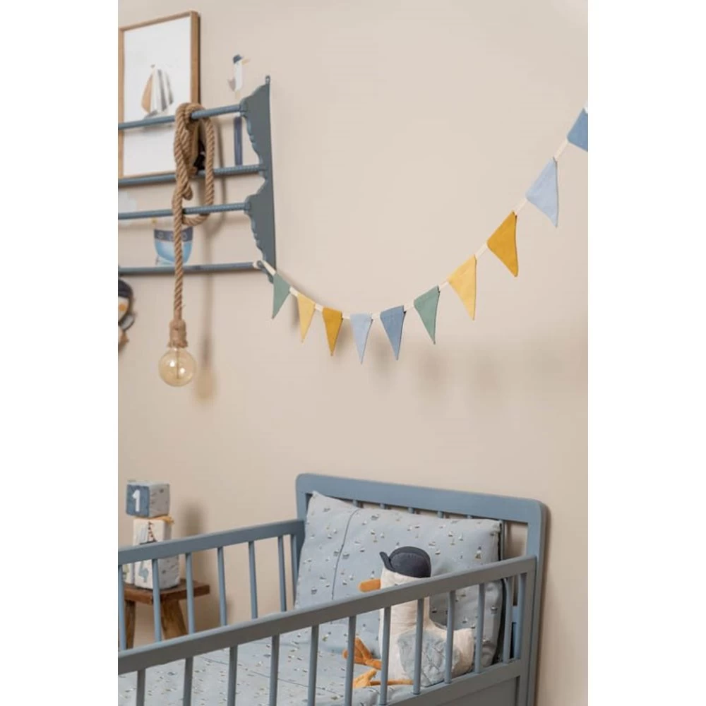 Vrolijk de babykamer op met deze mooie slinger van vlaggetjes. Wie zegt dat slingers alleen voor feestjes zijn?! Ze fleuren een kamer meteen op. Aan de muur, om de klamboe, op een boekenplank of ter versiering van een speeltent. Ga creatief aan de slag met deze charmante stoffen slinger in de zachte en speelse kleuren lichtblauw, blauw, geel, oker en groen.