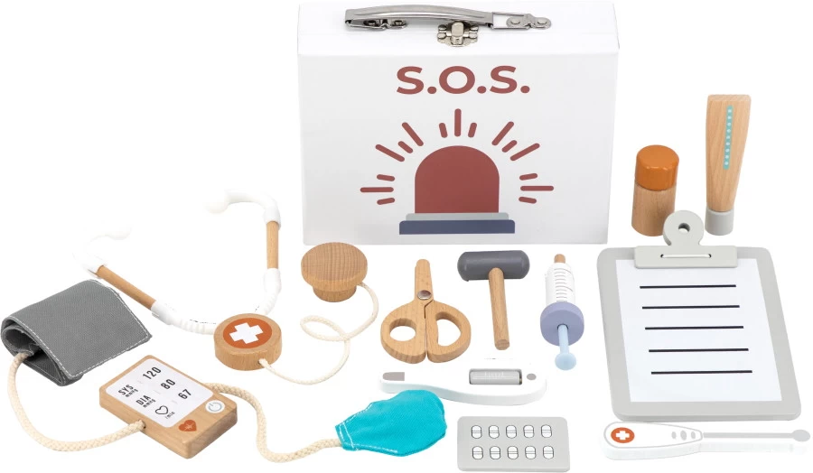 Je kindje zal zich een echte dokter voelen met dit houten dokterssetje van Tryco! Schrijf de patiënt medicijnen voor, geef hem/haar een spuit, meet de bloeddruk of luister naar de hartslag met de stethoscoop. De set is 12-delig en alle items zijn van hout gemaakt! (op het koffertje na)