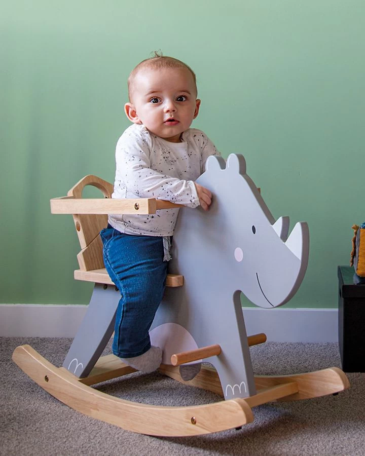 Dit houten Tryco hobbeldier in de vorm van een neushoorn zal prachtig staan in de baby- of speelkamer! Het hobbeldier is gemaakt van stevig hout en heeft een gesloten zitje, zodat je kleine er niet snel uit kan vallen. Ook kan je kindje zijn voetjes op de steuntjes leggen.