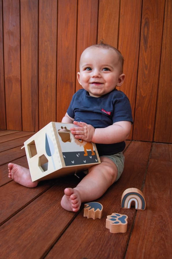 Plaats de juiste voetafdrukken van de leeuw en krokodil bij het juiste diertje met deze houten vormenstoof van Tryco! Daarna mogen ook de andere vormpjes in de juiste opening gestopt worden.