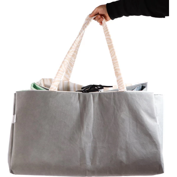 Is je kindje uitgespeeld? Maak binnen een handomdraai een opbergtas van het speelkleed! Vouw de zijkanten naar binnen en maak ze vast met de touwtjes. Al het speelgoed kan in de tas worden gestopt en gemakkelijk worden opgeborgen of meegenomen aan de hendels. Je kunt hem ook gebruiken als opbergmand. Super handig voor onderweg, een bezoekje bij opa en oma of lekker voor in huis.