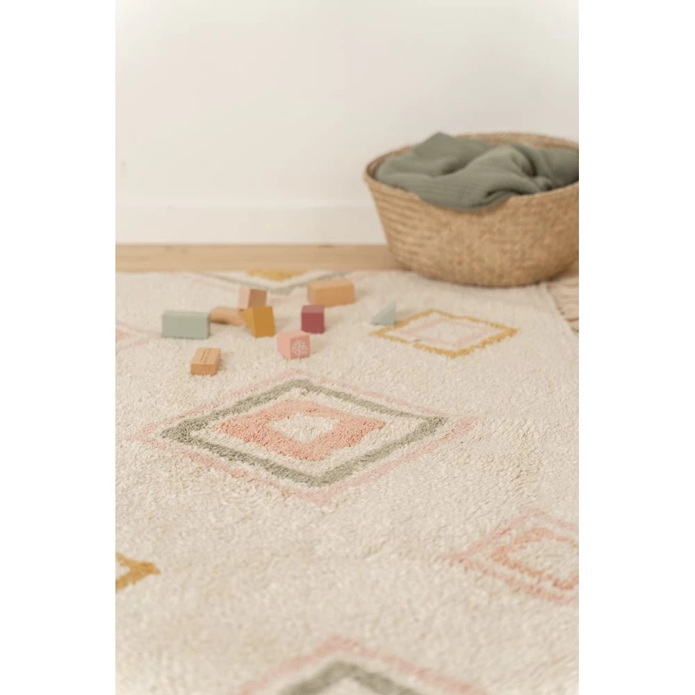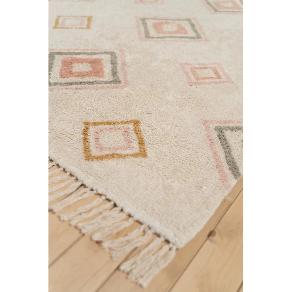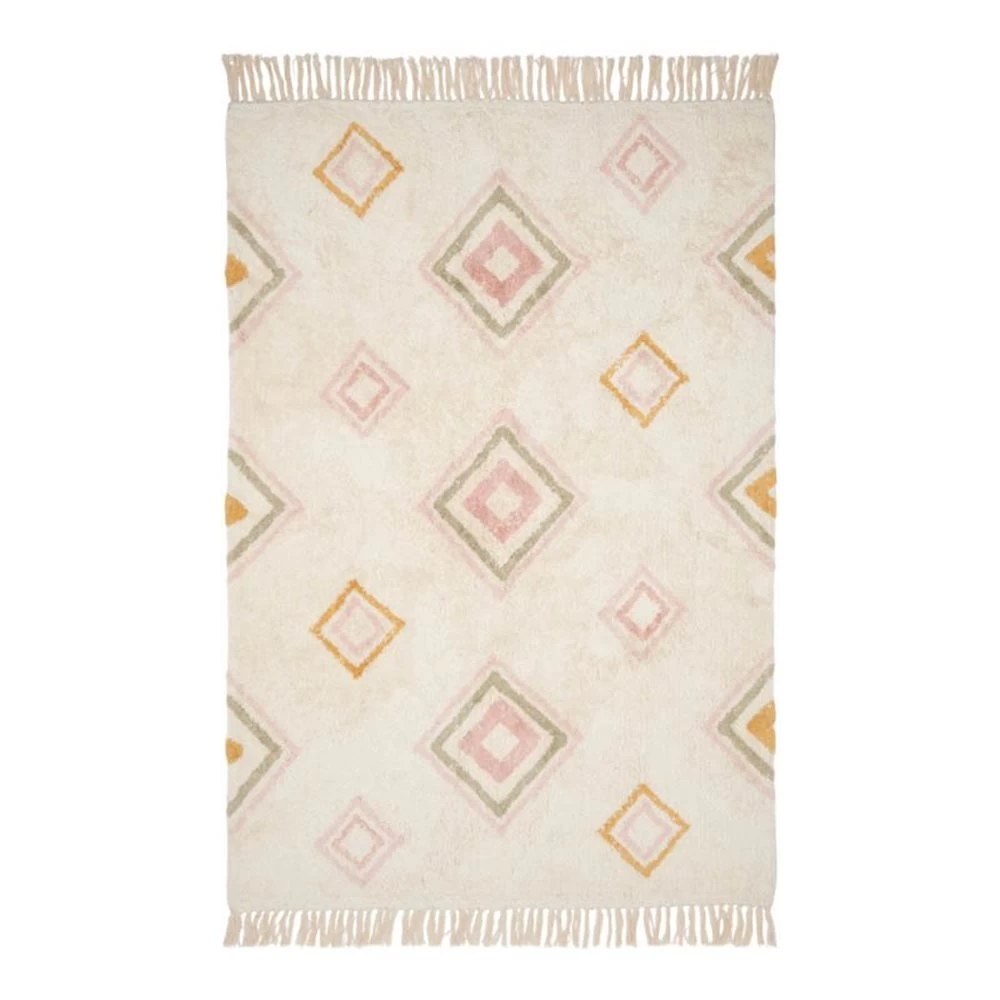 Dit rechthoekige vloerkleed met feestelijke kwastjes geeft een vintage tintje aan elke baby- of kinderkamer. De natuurlijke achtergrond is versierd met een kleurrijke Aztec print. Het vloerkleed meet 170 cm x 120 cm en is handgeweven van gerecycled katoen. Kies voor deze opbeurende sfeermaker om een neutraal interieur contrast te geven of ga juist voor een kleurrijke kinderkamerinrichting.