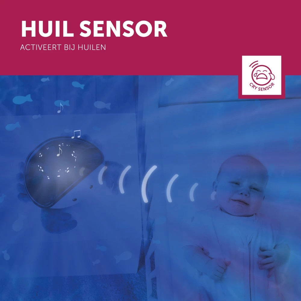 De bewegende golven en vele zwemmende vissen met oceaangeluiden zorgen ervoor dat je kindje rustig wordt (0-10 min). Daarna worden de visjes minder en worden de projecties lager in helderheid. Dit gecombineerd met geprojecteerde onderwater bubbels maken je kindje slaperig (10-20 min). Als laatste blijven de golven stilstaan en zijn de projecties op zijn laagste helderheid, het geluid stopt en je kindje valt in slaap (20-30 min). De projectie stopt automatisch na 30 minuten.